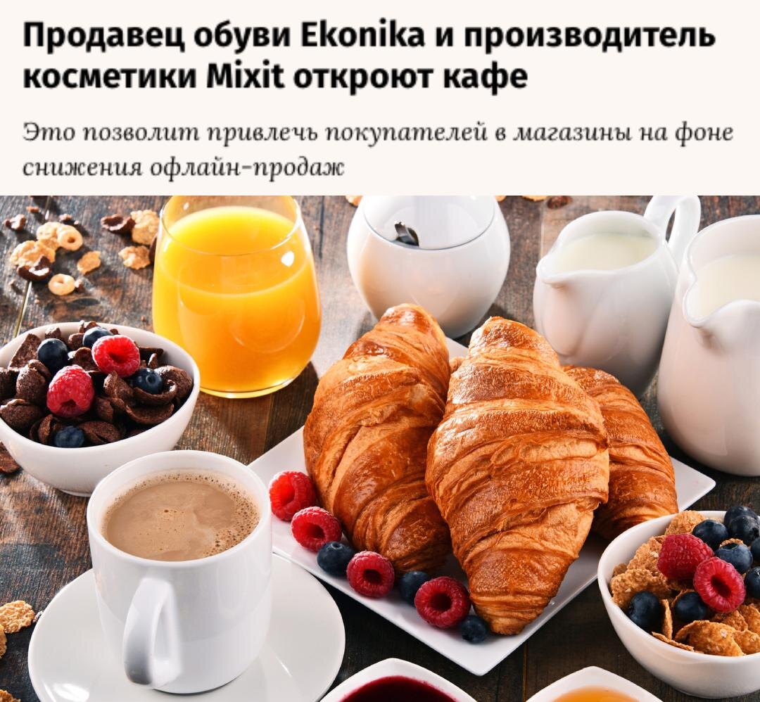 🇷🇺 Магазины одежды и обуви начали завлекать россиян запахом булочек и кофе — для этого ставят кофейни прямо в магазинах. Сети Ekonika и Mixit запускают собственные кафе, чтобы увеличить поток покупателей и сделать посещение магазинов комфортнее. Ekonika откроет кафе весной следующего года вместе с флагманским бутиком на Патриарших прудах, а Mixit запустит бьюти-кафе уже в декабре в бизнес-центре Comcity, где можно будет одновременно заказать кофе и купить косметику. 🍕ХОРЕКА | Новости и тренды