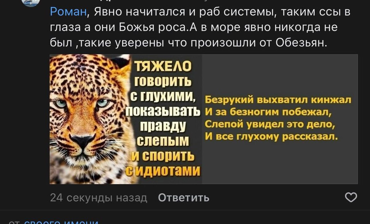 Как стать дураком? Вступив с пор с дураком. Хана будет. Там его территория, где он упорно будет биться и спорить за звание первого дурака. Тогда за что с ним биться, как делить место между первым и вторым? Вот именно, что не следует. Надо признать, что они вокруг всегда были и есть. Более того, ты для кого-то тоже входишь в эту категорию. Бороться с ними-все равно что успокаивать ветер. Самый лучший способ-игнорирование. А еще лучше-распознавание на подступах. Сегодня за достойный комментарий в ленте научной поставил👍Был действительно хороший, аргументированный ответ, заслуживающий одобрения. Спустя время мне пришел комментарий за мой 👍, то что на фото. Хороший пример распознать токсика и не вестись. Каждая фраза манипулятивна и способна спровоцировать защиту. Попробуем разобрать: “Явно начитался и раб системы»-Явно начитался-видимо я говорю, но сути не знаю, так как зомбирован, как и все другие и не хочу упорно знать правды. Так то ты не умный, ты просто начитался. Види
