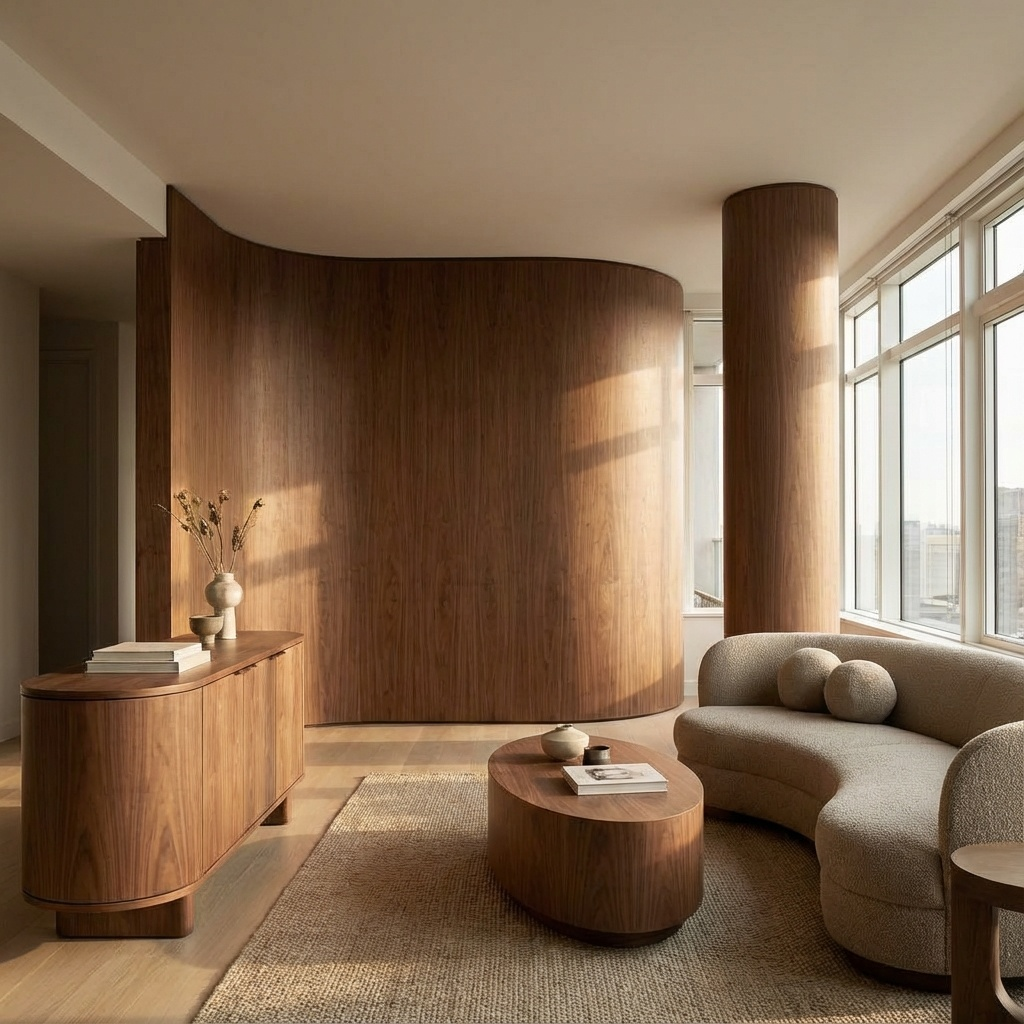 Шпонированные обои достаточно гибкие (особенно варианты на флизелине), чтобы "обнять" радиусную стену или колонну без стыков и углов.