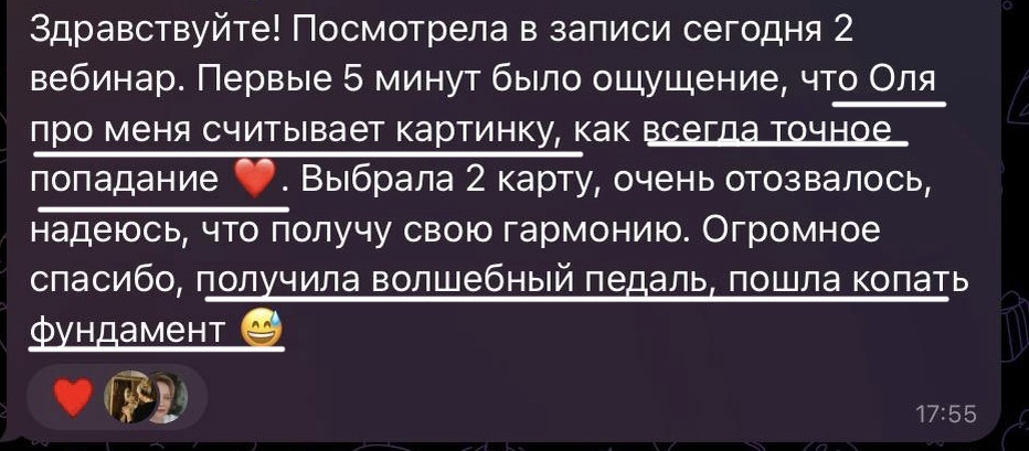 Я хочу поблагодарить каждую, кто принял в нем участие и решил сделать этот важный часть на встречу к новой себе. Вы уже видите немаленькие изменения, а прошло только 3 дня нашей работы. И знаете что? Это ведь еще не конец. Перемены будут «догонять» вас и дальше, вот увидите! И не сомневайтесь даже, у вас все получится, по-другому быть не может. Еще раз всех благодарю за участие и доверие ко мне. Очень ценю это.
