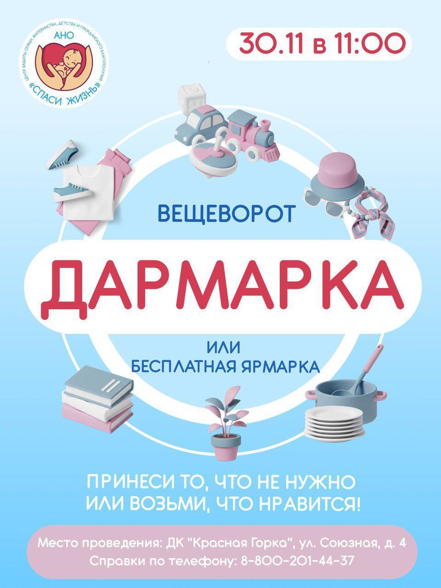 В День матери и накануне благотворительной акции «Щедрый вторник» пройдёт традиционная благотворительная ярмарка «Дармарка». 🌳 «Дармарка» - это самый экологичный проект нашего города. Не нужные вещи, книжки и игрушки не оказываются на городских свалках, а продолжают приносить пользу другим людям. 🛍👗👕👖🥾🧦🧤Приходите и выбирайте одежду для себя и своих близких, также детские книжки и игрушки. Также каждый желающий может принести лишние вещи, книжки и игрушки в хорошем и чистом состоянии. 💰По возможности, каждый желающий может сделать финансовое пожертвование на уставную деятельность организации (помощь семьям с детьми, одиноким пожилым людям). Таким образом, вы не только поддержите нашу организацию, но и станете участником крутой ежегодной акции «Щедрый вторник» , которая ежегодно проходит 2 декабря - Всемирный день благотворительности. 🏛Адрес проведения: г. Прокопьевск, ул. Союзная, 4 (ДК «Красная Горка», 1 этаж). Старт ярмарки в 11:00 часов. 🤝 Принеси то, что не нужно и