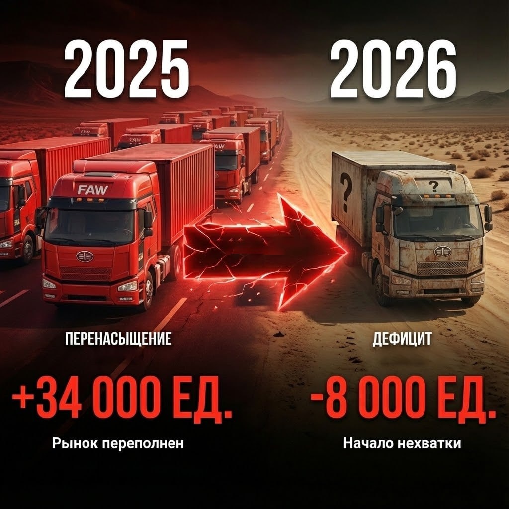 Друзья, делюсь своими расчётами по балансу транспорта на рынке и тем, к чему мы идём в ближайшие два года. Чтобы понять, когда рынок вернётся к нормальному состоянию, я сравнил фактические продажи тягачей с тем уровнем, который мы имели в стабильные годы (2015–2022). Тогда среднегодовой объём продаж составлял ~82 000 машин в год — это и был баланс, который обеспечивал нормальное насыщение рынка. 📌 Что произошло за последние годы 2023 — 130 000 2024 — 110 000 2025 (прогноз) — 40 000 Итого за 2023–2025: 280 000 машин Если бы рынок был в балансе, за эти три года должно было быть: 82 000 × 3 = 246 000 машин Разница: 280 000 – 246 000 = +34 000 единиц 👉 Перенасыщение рынка на конец 2025 года составит примерно 34 000 тягачей. 📌 Когда вернёмся к реальному балансу? Если взять ориентир в те же 82 000 машин в год, то на конец 2026 года должно быть: 82 000 × 4 (2023–2026) = 328 000 машин Теперь смотрим прогноз продаж с учётом снижения: • 2023 — 130 000 • 2024 — 110 000 • 2025 — 40 000