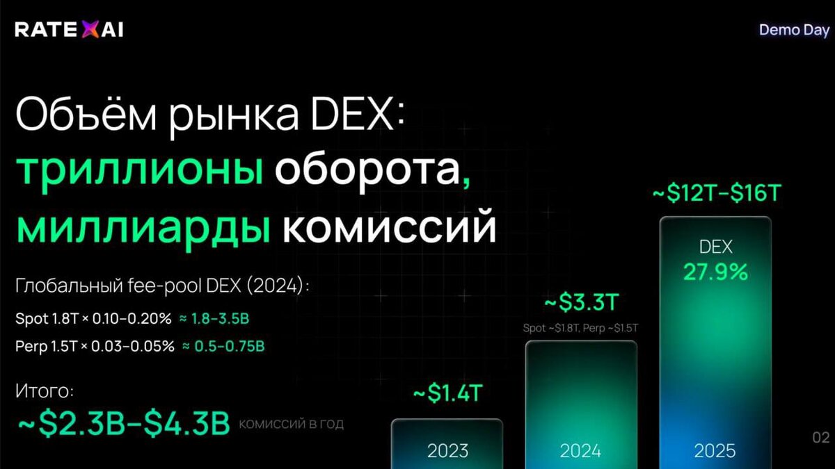 Ребята, апдейт по RateXAI и сразу важный момент по инвестициям. За последние месяцы мы сильно продвинулись: – собран и работает DEX-терминал с некостодиальным кошельком – AI-скоринг токенов, Smart Money потоки, новости, фундаментал — всё в одном окне – своя инфраструктура: ноды, big data, multi-chain (Solana, ETH, BSC, soon: Hype, Base) – органический трафик на сайт уже 20–30K визитов в месяц и растёт Рынок тоже едет: доля DEX в споте за несколько лет выросла с ~1% до почти 30%, а такие ребята как Axiom / GMGN / Hyperliquid уже делают десятки и сотни миллионов $ в год только на комиссиях. Мы делаем тот же класс продукта, но глубже по данным и умнее по AI. Сейчас мы ведём переговоры с фондами и стратегами по оценке проекта около $30M. Параллельно неожиданно освободился один приватный пул от предыдущего инвестора — очень интересная аллокация, которая больше никому публично не будет доступна. По сути, это возможность зайти раньше фондов и на условиях лучше, чем будут в следующем раунде