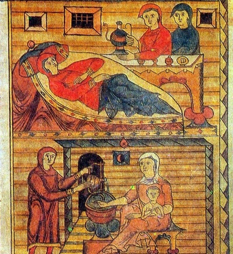 Повитухи редко вмешивались в процесс родов. То, что сейчас кажется очевидными процедурами (щипцы, кесарево сечение), тогда даже и помыслить было невозможно. После разрешения от бремени роженицу и дитя парили в бане. Считалось, что это очищает от скверны.