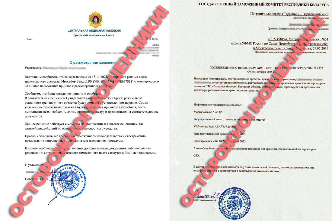 В Государственном таможенном комитете отмечают, что при выборе посредников для приобретения автомобилей за границей нужно быть бдительным. И прежде чем оплачивать таможенные платежи или утилизационный сбор за якобы доставленную машину, следует сперва внимательно проверить предоставленные документы, указанные в них сведения и проставленные на них печати. — На этапе «доставки» авто в белорусскую таможню, во многих случаях уже после перевода на счета злоумышленников приличных сумм, и возникают у покупателей вопросы к таможенным органам Беларуси, — отмечают в ГТК. Типичные обращения: «оплатил таможенную пошлину, фирма требует уплаты дополнительных платежей по причине задержания авто таможней», «у фирмы приобрел авто, мне прислали эти документы, по ним получается, что их выдала ваша таможня. Вопрос, вы их выдавали или нет?», «хочу купить автомобиль у компании. Так как очень много мошенников, прошу подтвердить выданный документ», «данный документ отправила мне компания по продаже автомобиля