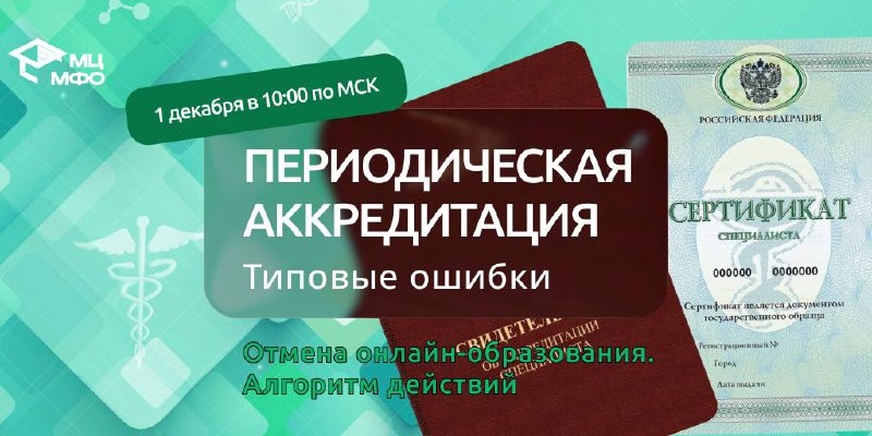 Приглашаем на онлайн-встречу по теме: «ПЕРИОДИЧЕСКАЯ АККРЕДИТАЦИЯ СПЕЦИАЛИСТОВ. ТИПОВЫЕ ОШИБКИ. Отмена онлайн-образования. Алгоритм действий» 🗓️ 1 декабря в 10:00 (по МСК) Лектор: Капустина Юлия Вячеславовна — д.м.н., профессор, международный эксперт по аккредитации. Её знания бесценны! Что разберём на встрече? ⬇️ • Отмена сертификатов специалистов после 31 декабря 2025 года. Что нужно делать прямо сейчас? • Баллы НМО! Вся правда! • Отмена дистанционного образования в медицине: последствия и новые реалии. • Порядок прохождения периодической аккредитации: Пошаговый алгоритм. • Типовые ошибки. Как их гарантированно избежать! • Отчёт о работе. Основные причины мотивированного отказа и как их исключить. • Расчет стажа работы. • Аккредитация в декретном отпуске. Особенности для мам. • Аккредитация медработников новых регионов РФ. Ключевые аспекты. 💡 Это не просто лекция, это ваш шанс получить ответы от эксперта и защитить свою карьеру! 👉 Регистрация по ссылке: https://kursm