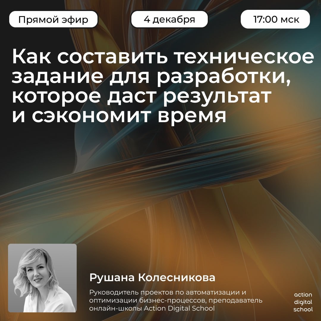 Приглашаем на онлайн-практикум «Как составить техническое задание для разработки, которое даст результат и сэкономит время» 🗓 Когда: четверг, 4 декабря ⏰ Во сколько: 17:00 мск 📍 Где: онлайн Спикер: Рушана Колесникова — руководитель проектов по автоматизации и оптимизации бизнес-процессов, с опытом работы главным бухгалтером 15 лет, преподаватель курса «Аналитик 1С» в Action Digital School На практикуме ждет разбор реального кейса — составление ТЗ для формирования автоматической рассылки актов сверки в 1С. Шаг за шагом вы научитесь: ⭐️ определять цель, источники данных и условия; ⭐️ описывать для программиста ожидаемый результат; ⭐️ оформлять грамотное техническое задание под любую задачу. 🎁 Всех участников ждет подарок от спикера — шаблон ТЗ, который можно сразу применять в работе. Зарегистрироваться на вебинар 👈