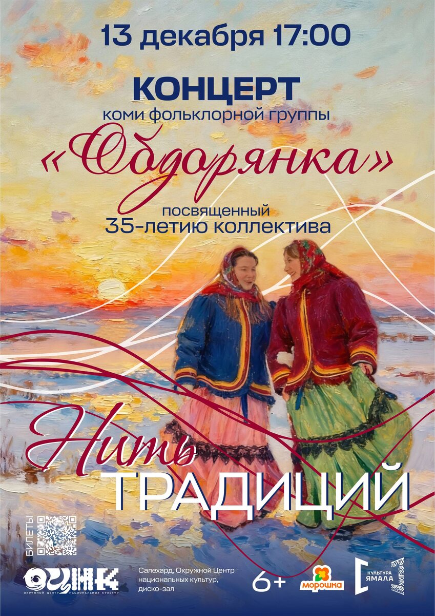 Приглашаем на юбилейный концерт коми фольклорной группы «Обдорянка» 🎉 13 декабря в 17:00 в Окружном Центре национальных культур состоится концерт, посвященный 35-летию со дня образования одного из старейших коллективов округа! За 35 лет творческой деятельности «Обдорянка» стала настоящим хранителем и популяризатором традиционной песенной и обрядовой культуры коми-народа. В ее репертуаре – различные песни, сказки, игры, хороводы, авторские и стилизованные песни, которые характеризуют региональные особенности культуры коми-зырян. Вход бесплатный. Забронировать место можно по ссылке: clck.ru/3QZAwT #ОЦНК #Салехард