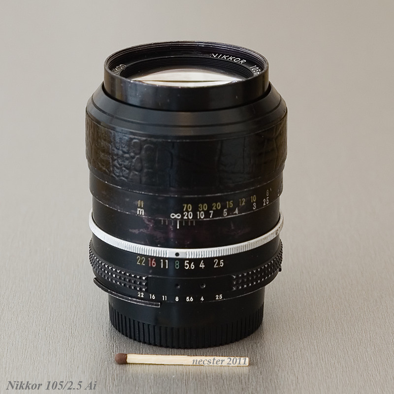 Если вам нужен недорогой портретник на цифровой Никон, то на этот объектив советую обратить внимание в первую очередь. Фокусное расстояние 105мм одинаково удобно для съёмки погрудного портрета, как на полном кадре, так и на кропе. Купил этот объектив я очень дёшево, в состоянии 3 с минусом; ему необходимо было заменить смазку геликоида и приклеить кожу вместо утерянного резинового кольца фокусера. В то время как практически все производители оптики выпускали фиксы с фокусным расстоянием 100 мм, Nikon в своих телеобъективах использовал 105 мм, что стало отличительным предложением. Вероятно, выражение «в стопятый раз» появилось именно тогда. Шутка. Впервые объектив Nikkor-P 10.5 см f/2.5, разработанный для дальномерной камеры Nikon, был представлен ещё в 1948 году. Он был практически копией Sonnar с оптической схемой из 5 элементов в 3 группах, и был перенесён на байонет F. В 1971 году объектив был пересчитан известным оптиком Nikkor-ов Симидзу Ёсиюки. Обновлённая оптическая схема предс