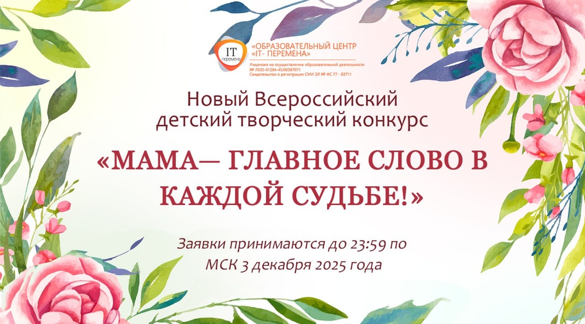 Открыта регистрация на бесплатный Всероссийский детский конкурс рисунков «Мама—главное слово в каждой судьбе» в честь дня Матери! Слово «мама» — первое, что мы шепчем, и самое важное, что несём в сердце всю жизнь. В преддверии самого тёплого праздника мы объявляем творческий конкурс «Мама — главное слово в каждой судьбе!», приуроченный ко Дню матери. Мы предлагаем детям выразить свою безграничную любовь и благодарность с помощью кистей и красок. Пусть на их рисунках расцветут портреты самых дорогих женщин, сцены семейного уюта или символы маминой заботы. Давайте вместе наполним этот мир красками детской любви и создадим уникальную галерею, где каждая работа будет говорить о самом главном слове. Ждём ваши тёплые и искренние работы! Электронные наградные документы - бесплатно! Заявки принимаются до 3 декабря 2025 года включительно. Ссылка на конкурс: https://itperemena.ru/glavnoeslovo