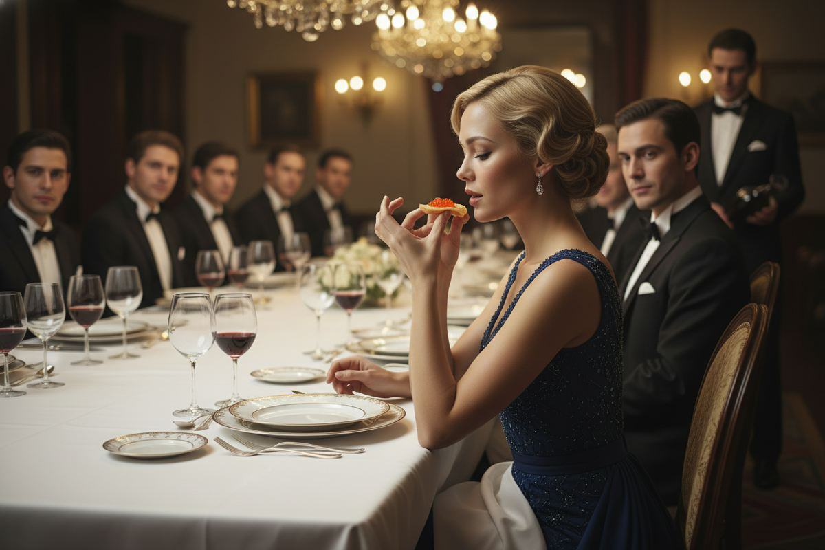 Блины подали на фарфоре, тонкие как папиросная бумага, с ложечкой красной икры сверху. Она взяла первый руками. Свернула аккуратно, поднесла ко рту. И только тогда заметила, как замерли соседи по столу. Как посол Франции медленно опустил вилку. Как её собственный муж побледнел и отвернулся к окну.