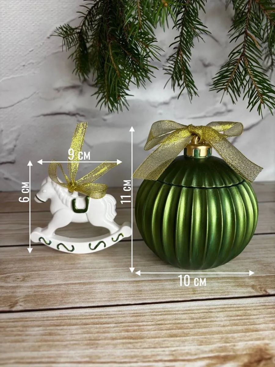 Этот набор — настоящее воплощение праздника в одном комплекте. Свеча в элегантном подсвечнике-шаре сочетается с игрушкой-лошадкой — символом наступающего года. Натуральный соевый воск обеспечивает чистое горение без копоти, а деревянный фитиль создаёт уютное потрескивание, напоминающее звук горящих дров в камине.