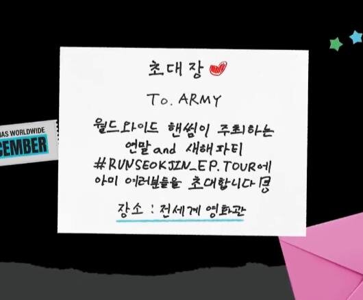 🔮 Перевод приглашения: Приглашение для Арми. Вы приглашены на вечеринку в конце года и Новый год, "RunSeokJin_Ep.Tour", организованную Всемирным Красавчиком! Место проведения: Кинотеатры по всему миру. #JIN @kumihobts