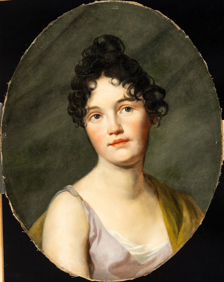 Иоганн Фридрих Август Тишбейн (1750–1812) был выдающимся художником второго поколения влиятельной семьи живописцев Тишбейн, родом из северной части немецкой провинции Гессен. Будучи придворным художником принца Вальдек-Пирмонтского, Тишбейн в молодости жил в Париже, Риме и Неаполе, прежде чем посвятить себя портретной живописи после длительного пребывания в Нидерландах. В 1800 году он был назначен директором Академии художеств в Лейпциге, позже получив прозвище "Лейпцигский Тишбейн". На рубеже XVIII и XIX веков он был особенно популярен благодаря своим портретам: вдохновляясь французскими и английскими образцами, он был одним из первых, кто сочетал чистоту неоклассической живописи с чувственностью и психологизмом романтизма. Как и на этом медальоне, он часто изображал членов своей семьи. Эта очаровательная юная леди с мечтательно устремленным вверх взглядом – его старшая дочь Каролина, которая также продолжила семейную традицию. Почти в такой же позе и одежде она изображена на по