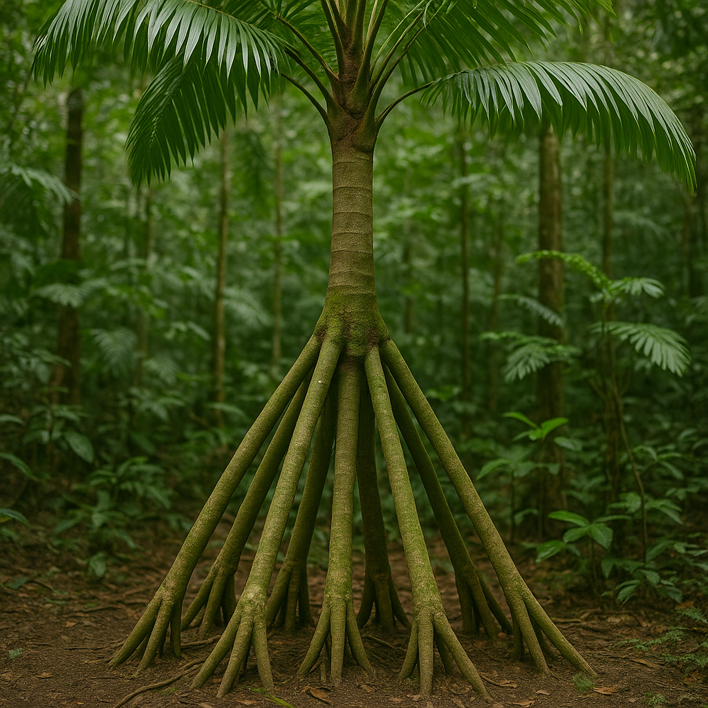 Они расходятся в стороны, как опоры. Если почва под деревом становится нестабильной — размывается дождями или уходит вниз — пальма начинает «переезжать». Происходит это так: Получается не шаг в привычном смысле, а постепенное перемещение всей конструкции. За год пальма может «уходить» на 20–30 сантиметров. Мало, но для растения — настоящий миграционный процесс. Амазонские почвы нестабильны: дожди размывают землю, дерево может потерять опору и упасть.