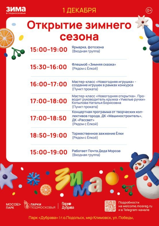 ✨ Открытие зимнего сезона в парке ДУБРАВА Вас ждёт 🎄 Мастер-классы: научитесь создавать новогодние украшения, открытки своими руками. 🪆 Ярмарка 🎶 Концерт любимых творческих коллективов. 🎲 Интерактивные развлечения и конкурсы ⛄️ Дед Мороз и Снегурочка 📮 А так же будет работать Почта Деда Мороза: отправьте своё письмо волшебному Дедушке Морозу и получите заряд позитива и улыбок. 🚫 Возраст: 0+ 📆 01.12.2025 🏢 Парк культуры и отдыха «Дубрава» 📍 г.о.Подольск, микрорайон Климовск, ул. Победы, д.3 💰 Вход свободный❗️ ⭐Поддержать канал голосом 🍰Где поесть в Подольске ✅ Мероприятия Подольск https://dzen.ru/id/66ed500f7b5671493eca3fd6 http://vk.com/podolsk_events http://dzen.ru/podolsk_events