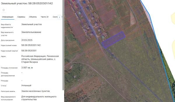 Название: Земельный участок из земель населенных пунктов с кадастровым номером 58:28:0520301:142, общей площадью 3057 кв.м., с видом