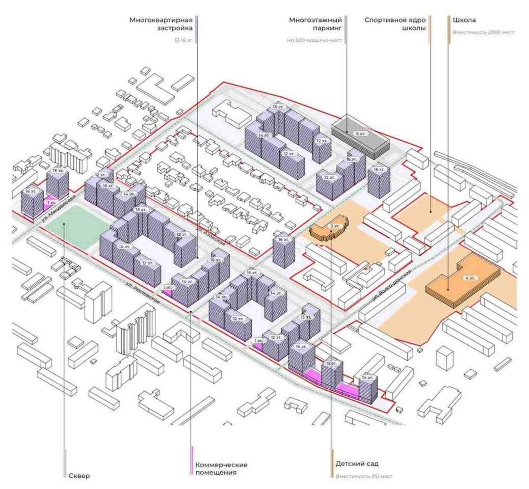 Архитектурная комиссия согласовала градостроительную концепцию комплексного развития территории (КРТ) жилых кварталов в Левобережном районе, сообщили 28 ноября в областном отделении Союза архитекторов. Там рассказали, что речь идет о кварталах, прилегающих к улицам Ростовской и Менделеева, площадью более 25 га. Проект разработало бюро «ПАСП». По словам его руководителя Андрея Тютерева, на месте существующих построек (в том числе – ветхих) предполагается строительство домов переменной высотности (от 12 до 16 этажей). Заказчиком проекта КРТ выступила администрация Воронежа. Предлагаемая типология застройки – квартальная, с разделением общественной и дворовой территории. Дворы планируются свободными от автомобилей – в границах КРТ предполагаются многоуровневый паркинг, а также открытые парковочные места. В рамках КРТ планируется реконструкция школы и строительство детского сада, создание спортивного ядра, дополнительное озеленение в районе улиц Менделеева, Ростовской и ряда других. – Даль