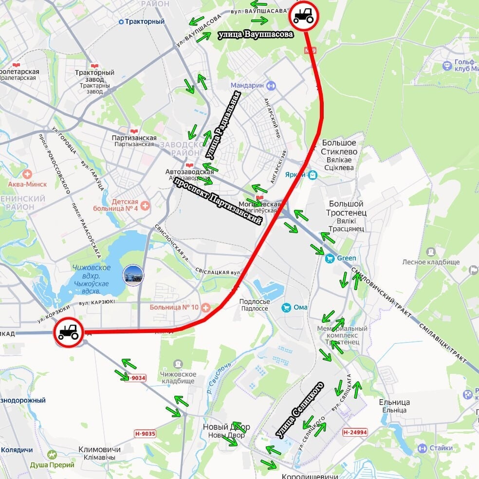 Во исполнение решения рабочей группы по развитию МКАД с 1 декабря будут введены ограничения движения колёсных тракторов и самоходных машин по кольцевой на участке от развязки с местным проездом улицы Ваупшасова и улицей Липковской до развязки с улицей Виктора Турова и автодорогой Н-9034, напоминает столичная ГАИ. Ограничение станет действовать в обоих направлениях. Схема: t.me/gaiminsk До указанного срока на отрезках улично-дорожной сети, прилегающих к данному участку МКАД, установят дорожные знаки 3.6 «Движение тракторов запрещено», обозначающие запрет на движение колёсных тракторов и самоходных машин, с табличками 7.5.4 с указанием времени (07:00—20:00). Объезд данного участка возможен по маршрутам: Госавтоинспекция просит участников дорожного движения учитывать данную информацию при выборе маршрута. Заглавное фото носит иллюстративный характер, архив av.by