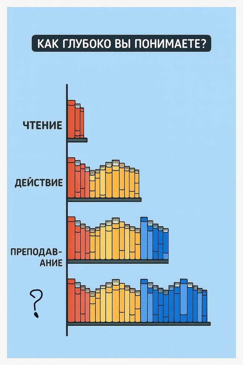 Есть в жизни забавная вещь — мы уверены, что отлично разбираемся в теме, пока не пытаемся объяснить её другому человеку. В этот момент реальность становится честной. Чтение даёт иллюзию знания.