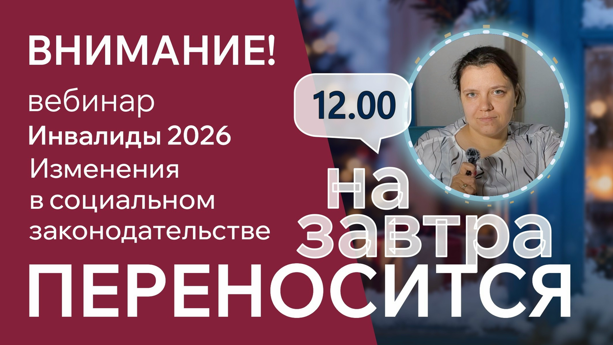 По техническим причинам неумолимой силы вебинар "Что нового для инвалидов в 2026 году" переносится на 29.11.2025 встречаемся в 12:00 Мск на Яндекс.Телемост