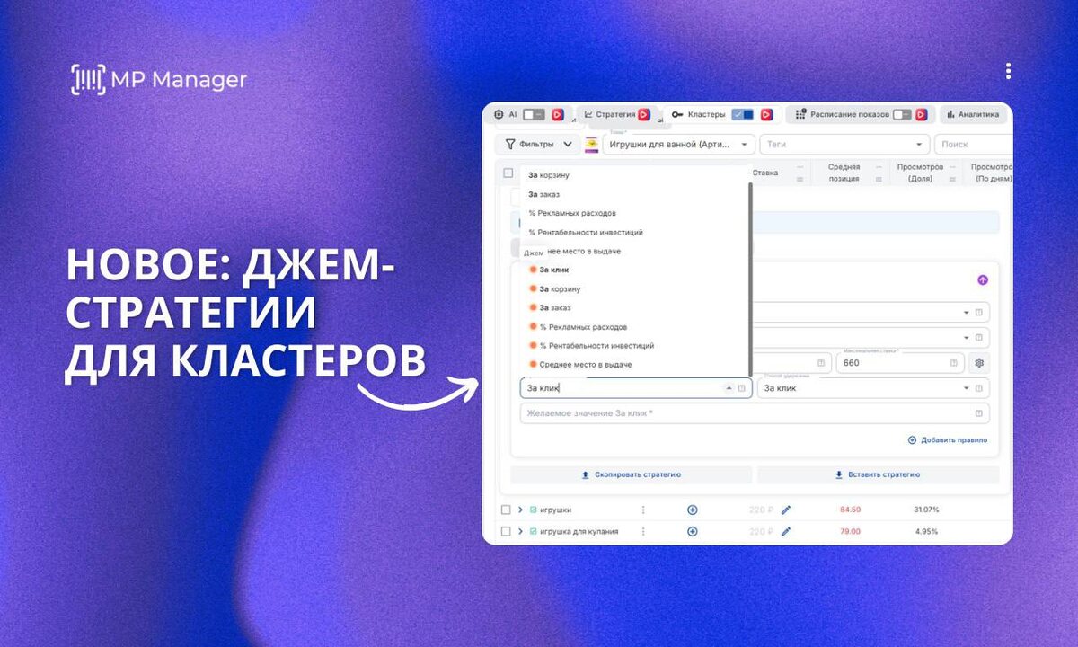 ΠΎΠ΄ΠΎΠ² (ΠΠΆΠ΅ΠΌ) β % Π Π΅Π½ΡΠ°Π±Π΅Π»ΡΠ½ΠΎΡΡΠΈ ΠΈΠ½Π²Π΅ΡΡΠΈΡΠΈΠΉ (ΠΠΆΠ΅ΠΌ) β Π‘ΡΠ΅Π΄Π½Π΅Π΅ ΠΌΠ΅ΡΡΠΎ Π² Π²ΡΠ΄Π°ΡΠ΅ (ΠΠΆΠ΅ΠΌ) π‘ ΠΠΎΡΠ΅ΠΌΡ ΡΡΠΎ Π²Π°ΠΆΠ½ΠΎ? ΠΠ»Π°ΡΡΠ΅ΡΡ ΡΠ°Π±ΠΎΡΠ°ΡΡ ΠΏΠΎ-ΡΠ°Π·Π½ΠΎΠΌΡ. ΠΠ΄Π½ΠΈ Π΄Π°ΡΡ Π·Π°ΠΊΠ°Π·Ρ, Π΄ΡΡΠ³ΠΈΠ΅ β ΡΠΎΠ»ΡΠΊΠΎ ΠΊΠ»ΠΈΠΊΠΈ, ΡΡΠ΅ΡΡΠΈ β ΠΏΡΠΎΡΡΠΎ ΡΡΠ°ΡΡΡ Π΄Π΅Π½ΡΠ³ΠΈ. ΠΠ΄Π½Π° ΡΡΡΠ°ΡΠ΅Π³ΠΈΡ Π½Π° Π²ΡΡ ΠΊΠ°ΠΌΠΏΠ°Π½ΠΈΡ β ΡΠ°Π±ΠΎΡΠ°Π΅Ρ. ΠΠ½Π΄ΠΈΠ²ΠΈΠ΄ΡΠ°Π»ΡΠ½Π°Ρ ΡΡΡΠ°ΡΠ΅Π³ΠΈΡ = ΠΌΠ°ΠΊΡΠΈΠΌΠ°Π»ΡΠ½Π°Ρ ΡΡΡΠ΅ΠΊΡΠΈΠ²Π½ΠΎΡΡΡ ΠΊΠ°ΠΆΠ΄ΠΎΠ³ΠΎ ΠΊΠ»Π°ΡΡΠ΅ΡΠ°. π ΠΠΎΡΠ΅ΠΌΡ MP Manager? ΠΠΎΡΠΎΠΌΡ ΡΡΠΎ ΠΌΡ Π΄Π°Π΅ΠΌ ΠΏΠΎΠ»Π½ΡΠΉ ΠΊΠΎΠ½ΡΡΠΎΠ»Ρ Π½Π°Π΄ ΠΊΠ»Π°ΡΡΠ΅ΡΠ°ΠΌΠΈ: βοΈ ΠΎΡΠ΄Π΅Π»ΡΠ½ΡΠ΅ ΡΡΡΠ°ΡΠ΅Π³ΠΈΠΈ βοΈ Π°Π²ΡΠΎΡΠΈΠ»ΡΡΡΡ βοΈ ΡΠΌΠ½ΡΠ΅ Π΄ΠΈΠ°ΠΏΠ°Π·ΠΎΠ½Ρ ΡΡΠ°Π²ΠΎΠΊ βοΈ ΠΏΠΎΠ΄Π΄Π΅ΡΠΆΠΊΠ° ΡΡΡΠ½ΡΡ