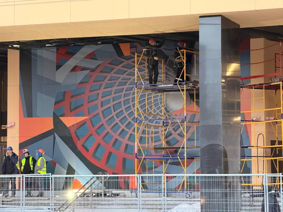 На строительной площадке будущей станции «Путиловская» Красносельско-Калининской линии петербургского метрополитена завершены работы по монтажу монументально-декоративного панно. Уникальная художественная композиция теперь украшает главный фасад вестибюля, выходящий на улицу Васи Алексеева. Об этом сообщает телеграм-канал «Подземник». Новое панно, выполненное на алюминиевых сотовых панелях, представляет собой впечатляющую абстрактную геометрическую композицию. В ее основе – динамичное изображение тоннеля, уходящего в перспективу. Центральный элемент панно, сформированный пересекающимися красными и синими решетками, создает выразительный эффект глубины и стремительного движения к яркому белому свету, расположенному в его сердцевине. Окружающие угловатые формы, выполненные в серых, синих и оранжевых тонах, усиливают ощущение динамики и подчеркивают индустриальный характер городской среды. Помимо основного декоративного элемента, на входе и выходе из вестибюля уже установлены навигационны