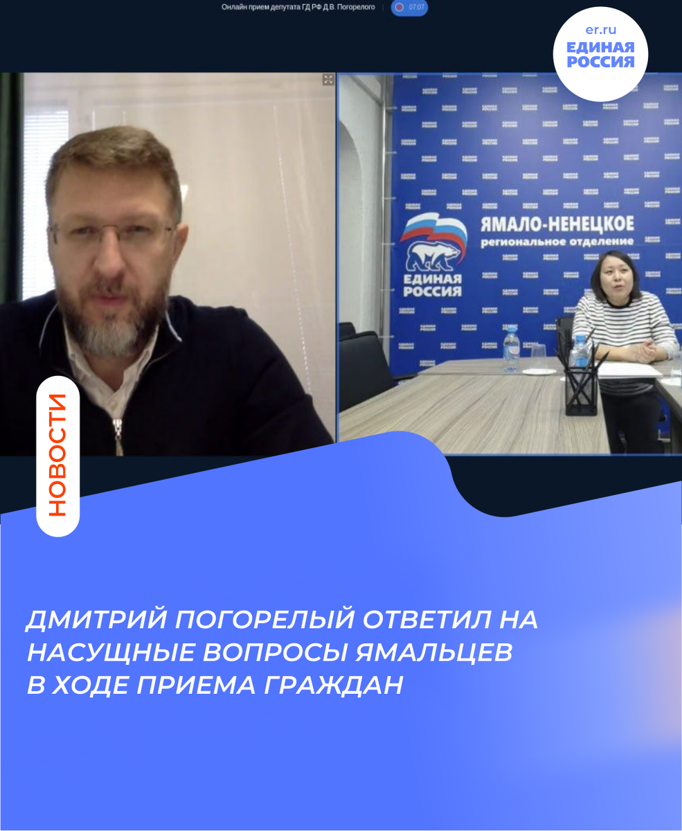 Прием граждан депутат Государственной Думы РФ провел в формате видеосвязи. Заявители обращались к Дмитрию Погорелому из приемной регионального исполнительного комитета «Единой России». Мама школьника из Салехарда поделилась с депутатом проблемой: сын отказался посещать вместе с классом бассейн, хотя заниматься плаванием хочет. Школьников водят на плавание в общий городской бассейн, где они вынуждены переодеваться в общей раздевалке и душевой со взрослыми посетителями. Северяне также рассказали о своих проблемах с жилищным вопросом. Помимо этого, вдова Леонида Васильевича Лапцуя – ненецкого писателя, переводчика, фельдшера, обратилась к депутату с идеей организации музея в честь своего погибшего супруга. Также в этом музее будет рассказана история Василия Тихоновича Подшибякина, советского геолога, участвующего в открытии крупнейшего в мире Уренгойского газового месторождения. Вместе с тем, Дмитрий Погорелый обсудил с ямальцами воспитание молодежи, а именно среднее профессиональное обра