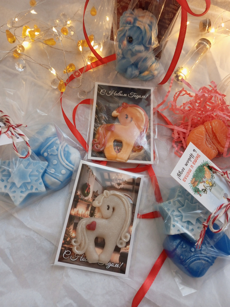 Да, вопрос, конечно, интересный, а самое главное, что многие посмеются и скажут, что за 100₽ подарок не сделать. А я сегодня с вами поспорю и покажу несколько презентов из мыла, бюджет которых от 100₽ и чуть выше. А самое главное, что такой подарок не будет выглядеть скупо и некрасиво, а наоборот, очень достойно. А вот и нет, деньги и именно за такую сумму я могу сделать для вас мыльную фигурку огненной лошадки- символа 2026. Огненная лошадка имеет вес 25 грамм и может быть выполнена с любым ароматом. Такая фигурка наполнит ароматом ванную, украсит интерьер или вашу ёлочку, ну а после новогодних праздников эту фигурку можно будет использовать по прямому назначению. Красавица идёт так же в паре с красивой новогодней открыткой и в отдельном пакете, который имеет размеры 8*10 см. Этот милый презент принесёт счастье и удачу в дом. Ещё один вариант подарка, но чуть дороже- это новогодние мыльные символы "Снежинка и сапожок". Они идут в паре, выполняются в одинаковых оттенках и прекра
