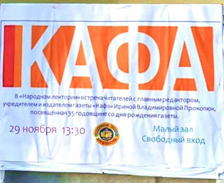 В субботу 29 ноября в 13.30 в малом зале городского Дома культуры состоится встреча читателей с Главным редактором, учредителем и издателем газеты «Кафа» Ириной Владимировной Прокопюк, посвященная 35 годовщине со дня рождения газеты. «Крымские новости» поздравляют Ирину Владимировну со знаменательной датой в главном деле ее жизни - издании полюбившейся феодосийцам газеты. 35 лет - это очень долгий путь, от информационного листка объявлений до многостраничной газеты. Тем более, что газет на бумаге почти не осталось. Это напряженный труд и огромная сила воли. Нам тоже довелось пройти период работы в «Кафе». Автор этих строк вспоминает, что никогда не было никаких проблем в публикации тех, или иных материалов. Было множество публикаций и о казачестве, о "Крымской весне", о крымских партизанах, репортажи о крестном ходе из Тополевки в феодосийский Казанский собор, о праздновании Дня Победы, о прекрасной крымской природе и, конечно же, о наших жуликах. Эта демократичность в выборе тем публи