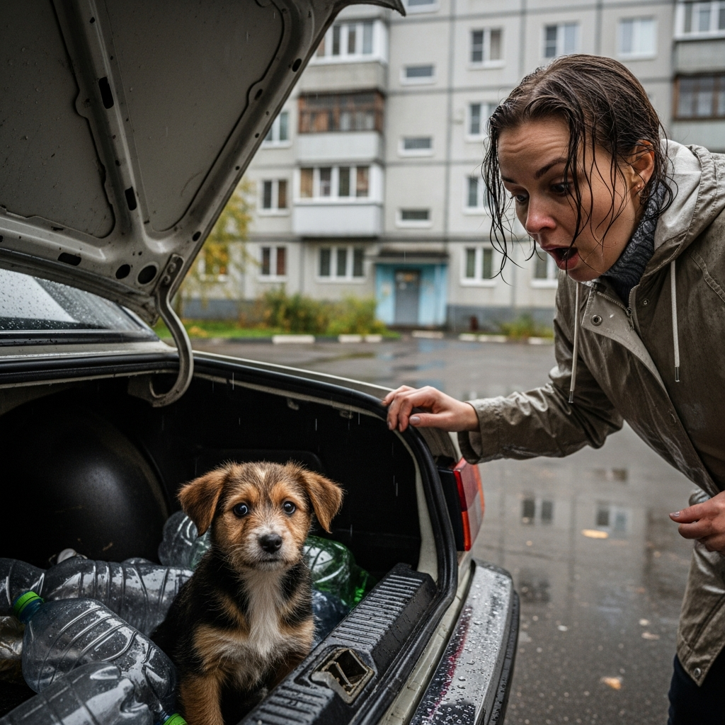 Ирина открыла багажник и замерла. Внутри, на сером коврике, среди пустых бутылок от воды и смятой тряпки, сидел щенок. Маленький, грязный, с висячими ушами и огромными карими глазами. Весь в репейниках, шерсть свалявшаяся. Щенок посмотрел на неё и тихонько скулил.
