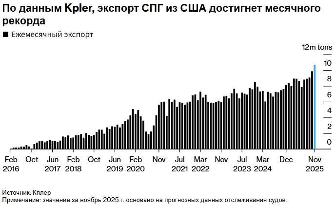 Это происходит как раз в преддверии увеличения зимнего спроса В этом месяце экспорт сжиженного природного газа из США достигнет рекордных показателей, что поможет стабилизировать цены на газ в Азии и Европе перед наступлением зимы. Согласно данным Kpler, в ноябре США планируют отгрузить 10,7 млн тонн СПГ, что на 40% больше аналогичного показателя прошлого года. Увеличение поставок может привести к снижению цен на газ в Европе и Азии на протяжении нескольких месяцев, несмотря на рост потребления топлива для отопления из-за похолодания. В четверг фьючерсы на газ в Европе упали до самого низкого уровня за более чем год, а цены в Азии, где находятся крупные импортеры, достигли минимума примерно за месяц. Новые проекты нацелены на долгосрочное увеличение экспорта СПГ из США. К концу десятилетия ожидается удвоение объемов производства. Завод в Плакеминесе уже наращивает мощности, а терминал Golden Pass может отправить первую партию до конца зимы. Новости рынка СПГ: Компания Gail частично выи