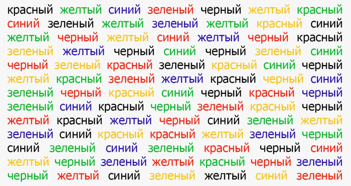 Давайте проще: вот вам картинка. Ваша задача не прочитать слова, а лишь назвать цвет в который они окрашены.