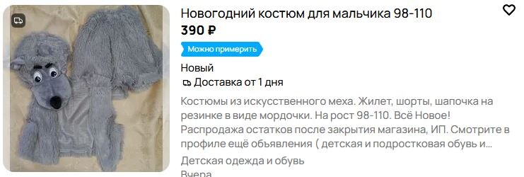Пик новогодних продаж пока еще не наступил, но в пунктах выдачи Авито все чаще встречаются атрибуты Нового года. Итак, что лучше всего продается в эти дни. Возьмите на заметку, чтобы хорошо заработать. 1. Детские новогодние костюмы. Как правило, это б/у костюмы для детского сада или начальной школы по невысокой цене, в среднем 400-500 рублей. Снеговики, зайчики, снежинки, Петрушки и т.п. Если ваш ребенок уже вырос из своих старых новогодних костюмчиков – самое время выложить их на продажу. Ориентируйтесь на цены конкурентов в этой нише, поскольку на сайте Авито обычно ищут то, что подешевле. Забирают их, как правило, даже без примерки. 2. Искусственные елки разных размеров. Тоже не новые, использованные. Самое время продать старую елку, если вы ей не пользуетесь или решили купить новую – больше/меньше, красивее или другой расцветки. Кстати, на маркетплейсах сейчас появились половинки елок для небольших квартир – это елки, которые имеют ветки не на все 360, а только на 180 гра