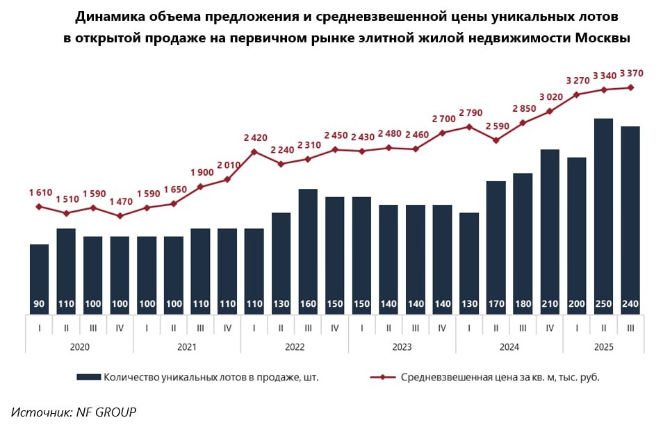 Когда деньги есть и их слишком много! 📊 NF Group зафиксировала новый рекорд - средневзвешенная цена эксклюзивных лотов элитной недвижимости в Москве достигла ₽3,37 млн за м2 по итогам сентября 2025 года. За пять лет цены удвоились, за год выросли на 18%. 🏢 В открытых продажах элитных новостроек сейчас около 240 уникальных лотов - это в 2,5 раза больше, чем было пять лет назад. Что такое уникальные лоты? Это не просто дорогие квартиры, а штучный продукт: пентхаусы на верхних этажах (84% предложения), сити-хаусы с отдельным входом (7%), таунхаусы и виллы (по 3%), плюс редкие форматы вроде скай-вилл и особняков в черте "старых" границ города. 🎯 Интересная штука: количество сделок за год упало на 21%, но их совокупная стоимость выросла на 20%. Это значит, что покупают реже, но дороже - эксклюзив становится всё более эксклюзивным. 💎 Эксклюзивные лоты в элитных новостройках - это недвижимость для весьма ограниченного круга покупателей. Соответственно ликвидность у них не очень, да и