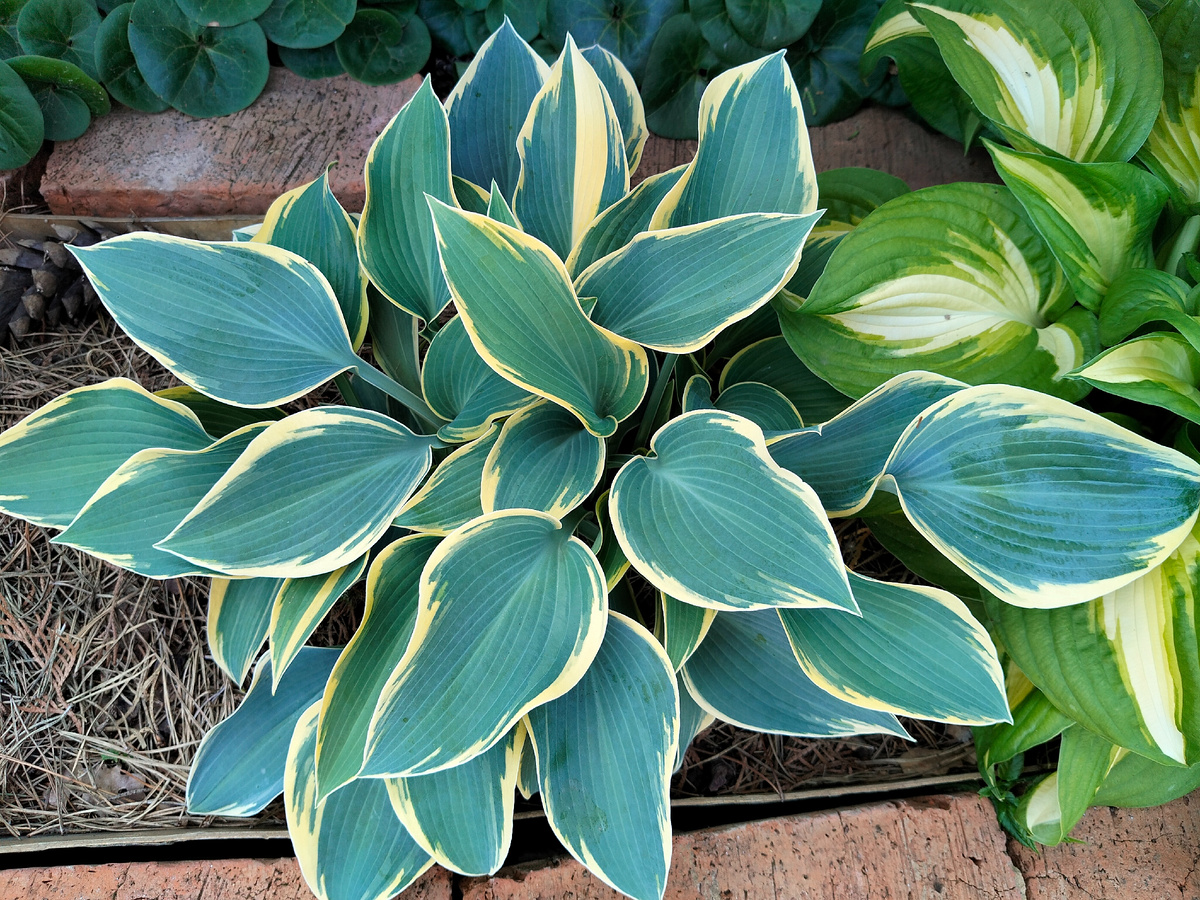 Эта хоста весной салатовая с голубой окантовкой. На фото она справа:
