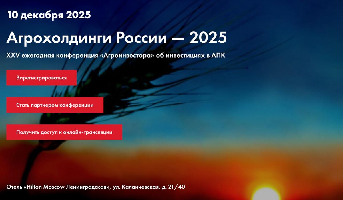 Крупнейшие игроки аграрного рынка подведут итоги года и обсудят новые инвестиционные и технологические возможности на XXV конференции «Агрохолдинги России — 2025» 10 декабря 2025 года в Москве, в отеле «Hilton Moscow Ленинградская», состоится XXV ежегодная федеральная конференция «Агрохолдинги России — 2025», организованная проектом «Агроинвестор». #Агроинвестор Подробнее ↗️