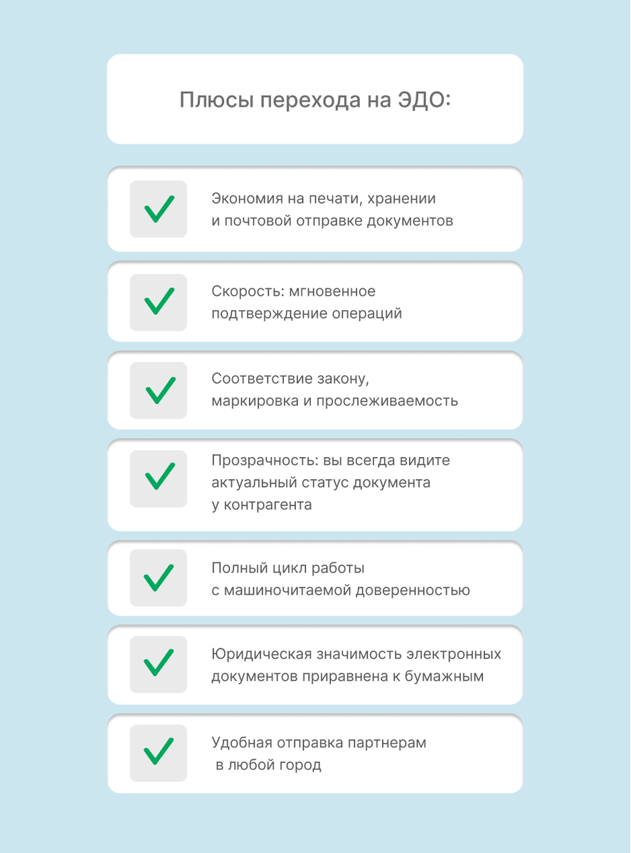 Но что же такое “ЭДО”? Это электронный документооборот, простой способ обмениваться документами без их печати на бумаге. Вы можете отправлять и получать счета-фактуры, УПД, накладные, акты и даже внутренние или транспортные документы. Главное, что такие электронные документы с электронной подписью имеют такую же юридическую силу, как и привычные бумажные с печатями и подписями.