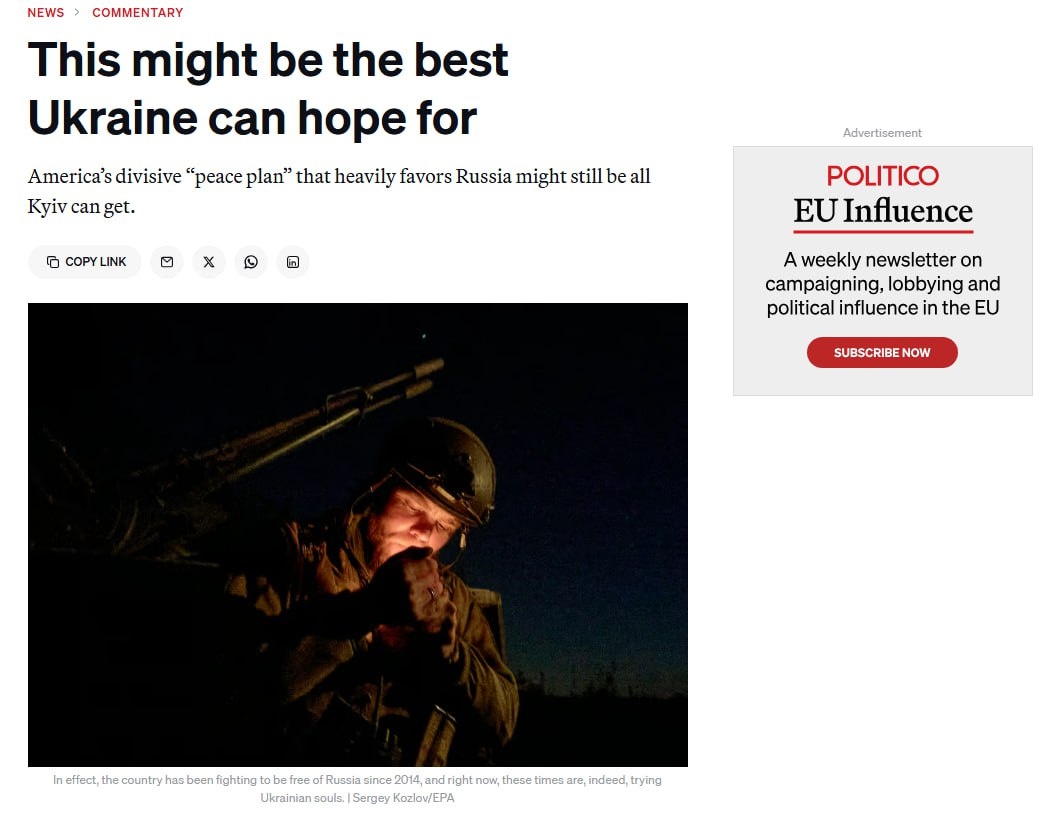 Западные СМИ рекомендуют Украине принять мирный план Трампа. По мнению Politico, он благоприятен для Москвы, но у Киева не остается более выгодных вариантов. «Это, пожалуй, лучшее, на что может надеяться Украина, или, по крайней мере, какой-то вариант, не предполагающий ухода с территории Восточной Украины, которую ей удалось удержать». Они все еще ставят какие-то условия? 👍 БайБайден. Подписаться