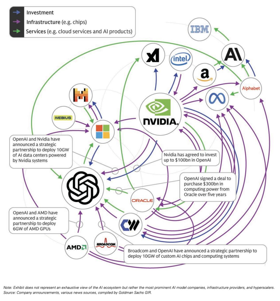 При этом интересен другой тренд: вокруг ИИ формируется сложный, перекрёстно финансируемый контур. Капитал, облака, производители чипов, разработчики моделей — все одновременно и клиенты, и инвесторы, и партнёры друг друга. В центре этой сети стоят, по сути, два столпа: NVIDIA (железо) и OpenAI (модели и «витрина» ИИ для мира).