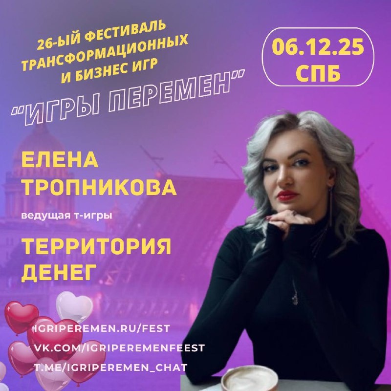 Фестивали трансформационных игр в декабре Хочу поделиться хорошей новостью! В декабре я буду вести трансформационную игру Территория денег на двух фестивалях: 🗺06 декабря - оффлайн фестиваль трансформационных игр; 🗺 14 декабря - онлайн фестиваль трансформационных игр. Если давно хотелось попасть на игру, но никак не решались - это отличный формат, потому что можно попробовать разные игры в одном месте и почувствовать, какая подойдёт именно тебе. Немного о самой игре. 🧩 Территория денег - это про отношения с деньгами, которые мы строим внутри себя. Про убеждения, страхи, внутренние ограничения и про разрешение себе получать больше. Игра помогает увидеть, что именно мешает увеличению дохода и какие шаги будут работать именно для тебя. Зачем идти на фестиваль т-игр: 🧤 можно попасть сразу на несколько игр за один день и понять, что мешает двигаться в разных сферах жизни; 🧤 познакомиться с людьми, которые тоже развиваются и ищут новый путь. Люди на этих фестивалях - это всегда отд