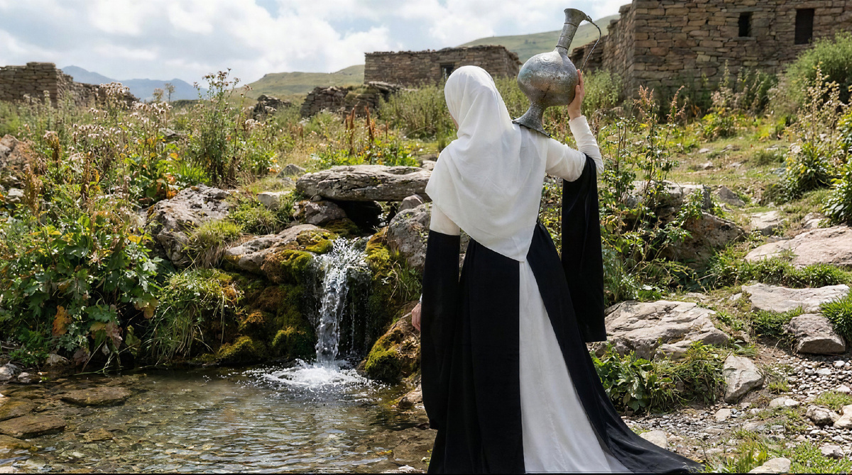 В мире без соцсетей главным местом для знакомств был родник. Именно туда, с кувшином на плече, девушка шла не только за водой, но и за судьбой. Для знакомства юноши с девушкой существовал специальный традиционный обряд БIаьрга тоха вахара (смотрины). Поход к роднику являлся не просто бытовой рутиной, а целым «выходом в свет», к которому тщательно готовились: надевали самые красивые платья и платки. Родник был едва ли не единственным местом, где девушка получала возможность показать себя и увидеть других. Влюбленный юноша мог прискакать на коне, обменяться взглядом с девушкой и обратиться с просьбой дать напиться воды из кувшина. По тому, как она реагировала на его просьбу, как подавала кувшин и ждала, когда юноша вернет его (а последний намеренно оттягивал время возвращения кувшина, проверяя ее терпение), он делал выводы о том, принимает ли она его знаки внимания. Со своей стороны, девушка обращала внимание на сдержанное поведение юноши. В этом немом диалоге у родника, полном сдержанны