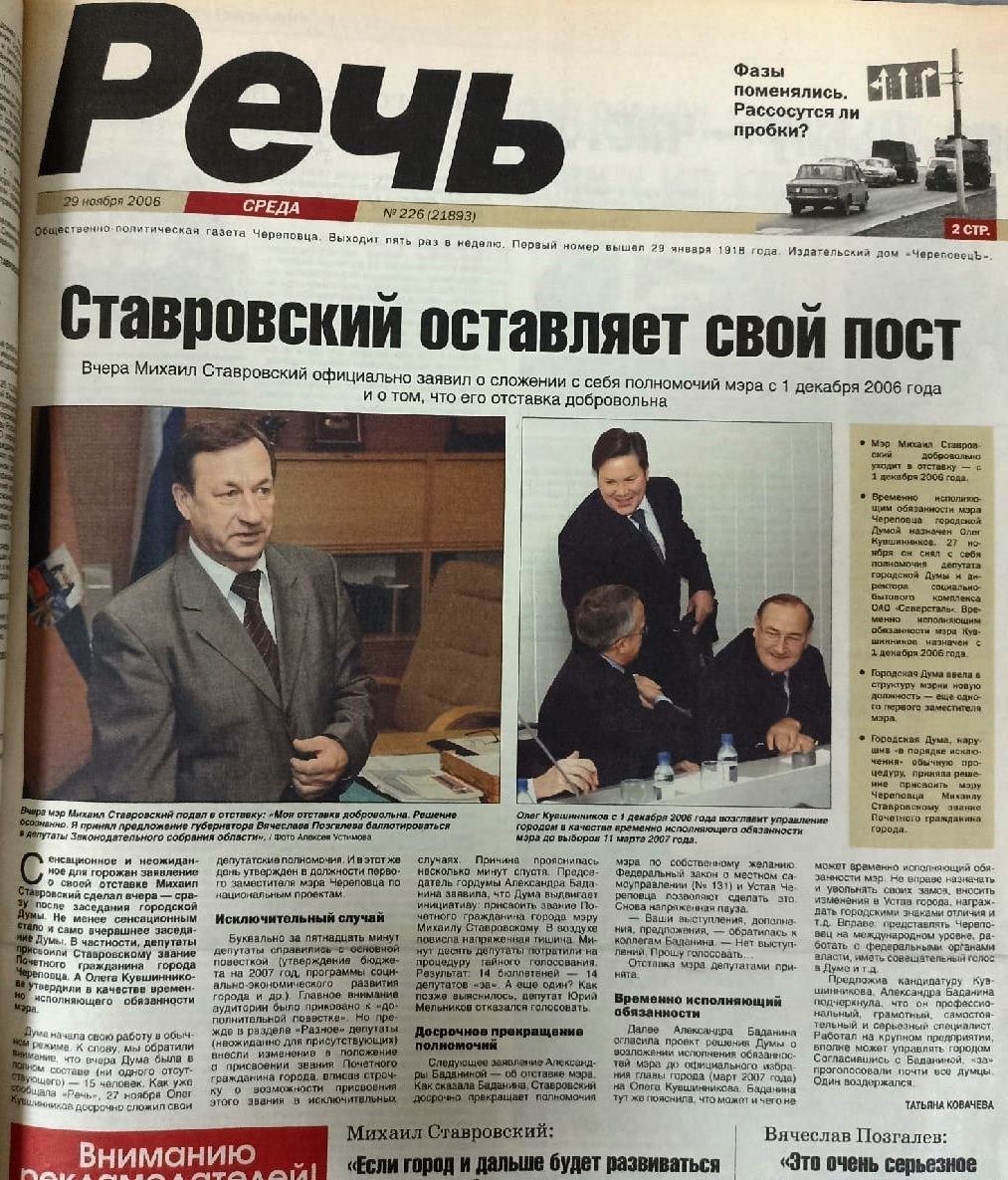 В 2006-м Ставровский покинул пост мэра #АрхивРечи 28 ноября 2006 года Михаил Ставровский официально заявил о сложении полномочий мэра Череповца с 1 декабря по собственному желанию. Врио мэра назначен Олег Кувшинников, который днем ранее снял с себя полномочия депутата городской думы и директора СБК «Северстали». Сенсационное и неожиданное для горожан решение мэр прокомментировал так: «Моя отставка добровольна. Я принял предложение губернатора Вячеслава Евгеньевича Позгалева баллотироваться по партийным спискам в Законодательное собрание области». Выборы должны состояться в марте 2007 года. Ставровский признался, что о назначении Олега Кувшинникова узнал от самих журналистов, при этом отметил, что у Олега Александровича есть все для успешной работы в этом качестве: опыт, здоровье, молодость. Губернатор Вячеслав Позгалев сказал, что Ставровскому «скучно в Череповце; может быть, комфортно, но скучно», и новая работа откроет перед ним новые возможности.