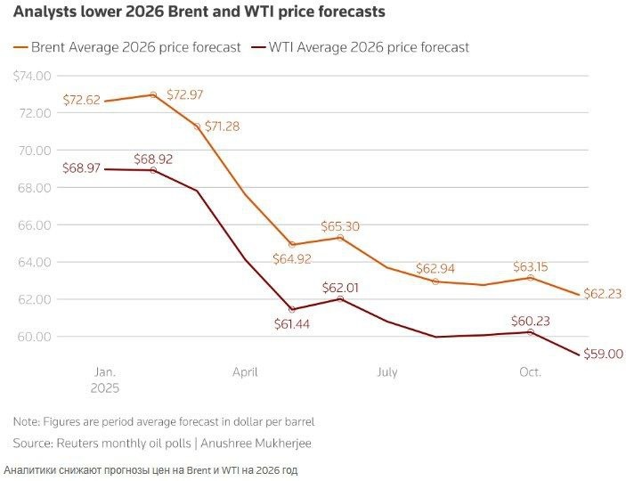 ⚡️Средняя цена на нефть марки Brent составит $62,23 за баррель в 2026 году. Прогнозируется, что средняя цена на нефть WTI составит $59 за баррель в 2026 году☝️ Согласно прогнозам, цены на нефть в 2026 году останутся под давлением из-за роста запасов, которые превысят незначительное увеличение спроса, а геополитические риски будут сдерживать более существенные падения, показал опрос Reuters, проведенный в пятницу. По данным опроса, в котором участвовали 35 экономистов и аналитиков, средняя цена на нефть марки Brent в 2026 г составит $62,23 за баррель, что ниже октябрьского прогноза в $63,15. С начала 2025 г средняя цена на нефть марки Brent составила $68,80 за баррель. Средняя цена на американскую нефть прогнозируется на уровне $59 за баррель, что ниже предыдущего прогноза в $60,23.