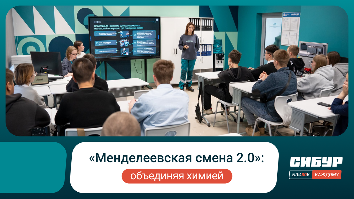 И с ним — наш маскот Каталик. Они здесь, чтобы поприветствовать школьников и студентов, участников «Менделеевской смены». За два года работы нашей программы их собралось более 30 тысяч со всей России: — 14 тысяч школьников в 2024 году —19 тысяч школьников в 2025 году — более 1000 студентов — и 35 городов-участников! А еще с нами было 745 амбассадоров-сотрудников СИБУРа: среди них члены правления, директора предприятий, руководители производств, дивизионов, функций, главные инженеры, технологи, химики. И впервые к нам присоединились клиенты СИБУРа — на реальных примерах они показали, как полимеры улучшают свойства их продукции и меняют целые отрасли. «В этом году проект впервые вышел за пределы школ и охватил средне-специальные и высшие учебные заведения, где мы провели «антипары». Мы стремимся не только передать знания и поделиться философией компании, но и вдохновить учащихся стать частью технологий, которые меняют мир. Такие уроки заряжают эмоциями всех — и учеников, и сотрудников. М