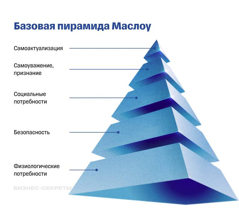 В 1943 году американский психолог Абрахам Маслоу предложил иерархию потребностей, которые последователи учёного назвали базовой пирамидой Маслоу. По этой теории, у человечества пять уровней основных потребностей. Маслоу предположил, что потребности имеют иерархию: прежде всего нужно удовлетворить базовые, а только потом переходить к более высоким. При этом границы между уровнями достаточно размытые, они могут пересекаться и влиять друг на друга. Порядок потребностей может меняться в зависимости от ситуации и особенностей человека. Многие люди часто одновременно стремятся удовлетворить сразу несколько разных потребностей, а не одну за другой. Данная теория широко применяется в маркетинге и менеджменте. Но эта теория не идеальна. Среди последователей Маслоу сложилось убеждение, что если человек доберётся до вершины, то сможет управлять теми, кто внизу. Но есть одно важное но. В эту пирамиду не входит забота о самом человеке, как о духовной сущности. Лично для меня это главное. Духовное р