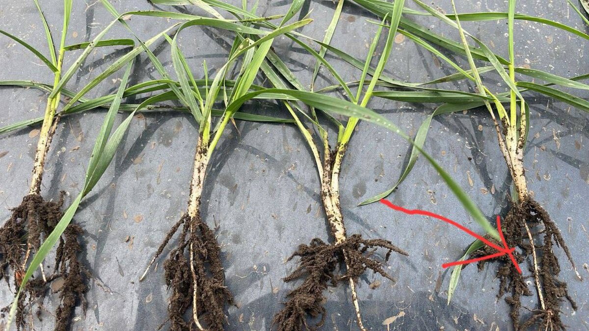 Многие спрашивают, что это за отросток между семенем и узлом кущения? Это называется - надсемядольное колено - ЭПИКОТЕЛЬ 🧐 Почему он формируется? Часто глубина формирования узла кущения не зависит от глубины посева семян. Это зависит от света: при недостатке света, узел кущения закладывается ближе к поверхности, а в солнечную погоду глубже или на глубине сева. Плюсы эпикотеля при глубокой заделке (5–6 см): растение тратит меньше энергии на "пробой" почвы, узел кущения формируется выше, посевы быстрее кустятся. Минусы — главная засада: эта тонкая, незащищенная зона становится дверью для патогенов. Корневые гнили проникают легко, поднимаются по стеблю, наносят вред. Что делать? Оптимальная заделка 4–5 см: короткий эпикотель или его отсутствие, сбалансированная корневая, отличное кущение, минимум рисков. *если бы на данном фото, на данном этапе развития пшеницы, при такой глубине заделки не сформировался эпикотель, то такого кущения бы не было. #АгроМир #Гипокотиль #Микроудобре