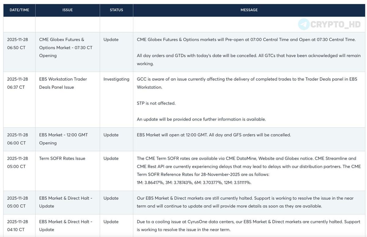 🟢 Биржа CME почти полностью возобновила работу – статус Торги фьючерсами и опционами на Чикагское товарной бирже скоро откроются. Не работают только отдельные панели и сервисы EBS (это межбанковский рынок, не розница). Стоимость индексов S&P 500 и Nasdaq 100 теперь должна отображаться нормально. Ранее: масштабный сбой Crypto Headlines
