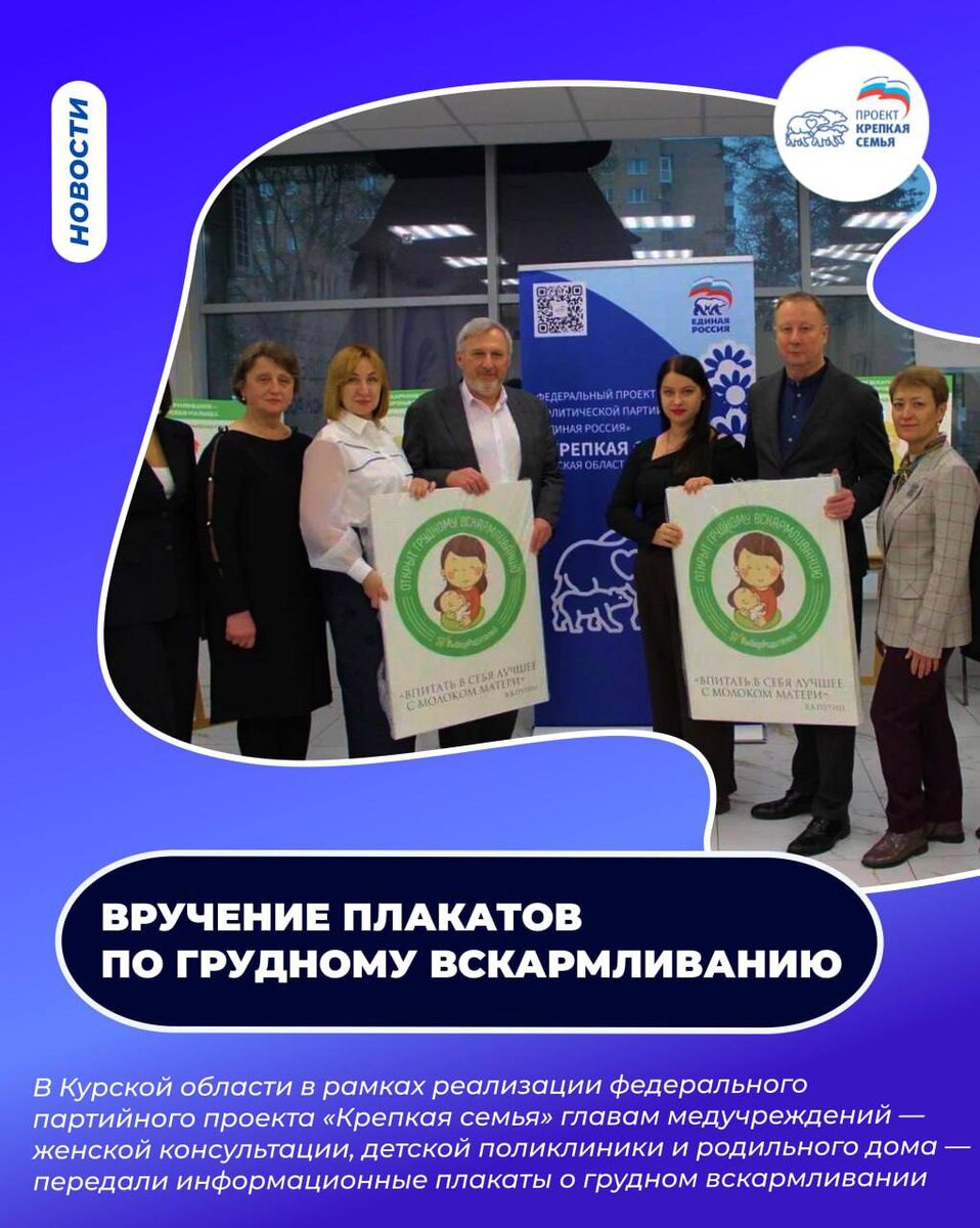 ⭐️ «Грудное вскармливание – основа здоровья малыша»: в Курской области вручили плакаты о грудном вскармливании 👏 В Штабе общественной поддержки «Единой России» Курской области в рамках реализации федерального партийного проекта «Крепкая семья» (направление «Открытый роддом» при поддержке АНО «Выбор родителей») главам медучреждений города Курска — женской консультации, детской поликлиники и родильного дома — передали информационные плакаты о грудном вскармливании. ✅ Особое значение мероприятию придало участие в формате удаленного подключения координатора федерального партийного проекта «Крепкая семья», депутата Государственной Думы ФС РФ Татьяны Викторовны Буцкой. Также присутвовали: врио первого заместителя министра здравоохранения Курской области Павел Вячеславович Калуцкий, региональный координатор федерального партийного проекта «Крепкая семья» Беседина Елена Вячеславовна, руководитель Регионального исполнительного комитета партии «Единая Россия» в Курской области Муравьев Сергей