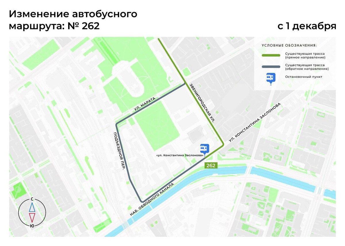 С 1 декабря 2025 года автобусный маршрут № 262 «Автобусная станция «Наличная ул.» – Звенигородская ул.» будет изменен. Основное изменение связано с переносом конечной остановки. Теперь маршрут будет заканчиваться на улице Константина Заслонова вместо Подъездного переулка. На улице Константина Заслонова у домов 9-11 по Загородному проспекту будет открыта новая остановка «ул. Константина Заслонова». А также маршрут получит новое название: «Автобусная станция «Наличная ул.» – ул. Константина Заслонова». Пассажирам рекомендуется учитывать эти изменения при планировании поездок. Ранее «Петербургский дневник» писал о том, что автобус № 29 меняет маршрут из-за матча на «Газпром Арене».